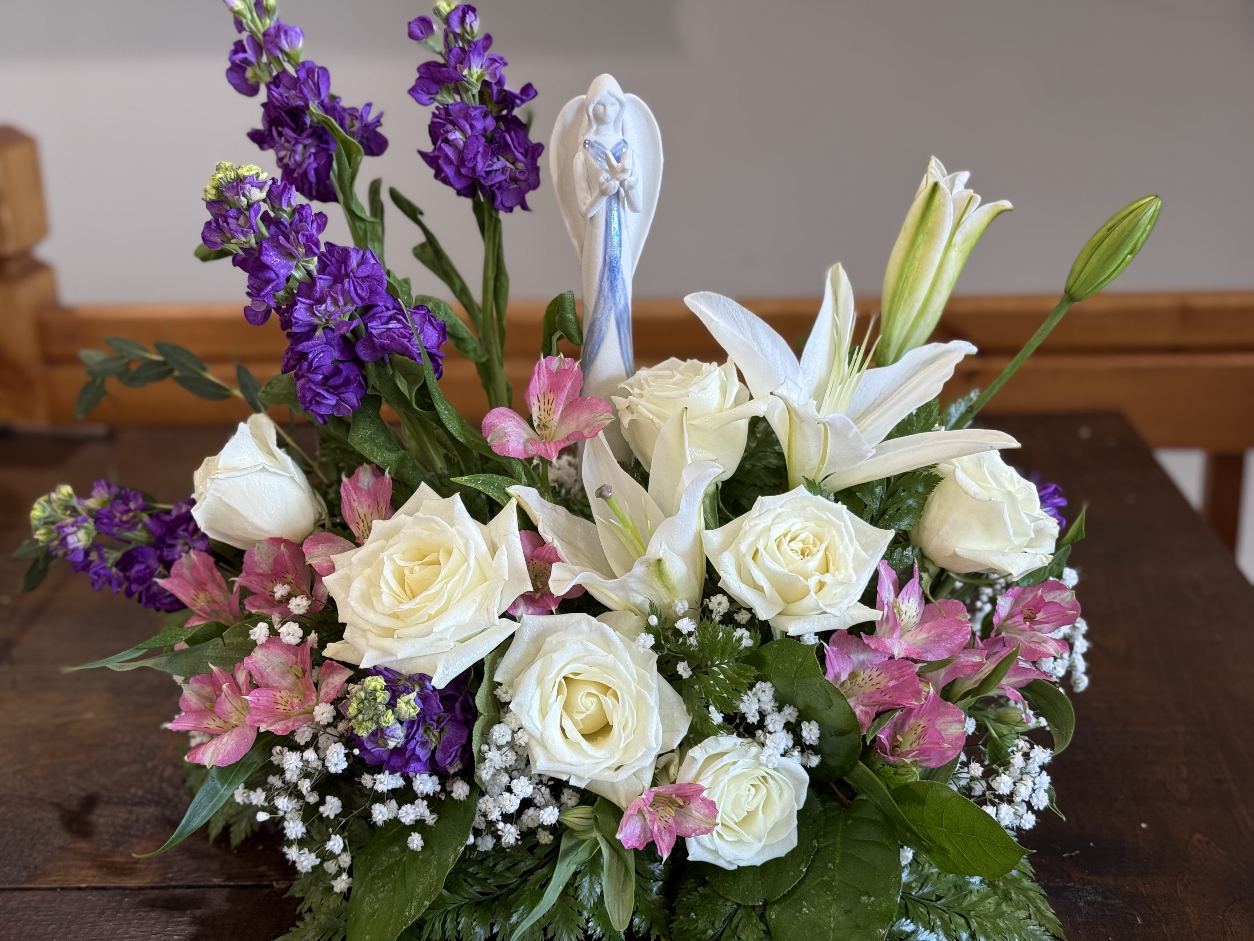 Delivered perfectly. The arrangement was substantial, selected premium, colors matched the spray on coffin. The adorned the alter. Very impressed. Not cheap but less than some competitors. One told me to order closer to church, traffic. Thank you, 5 star. Lynne